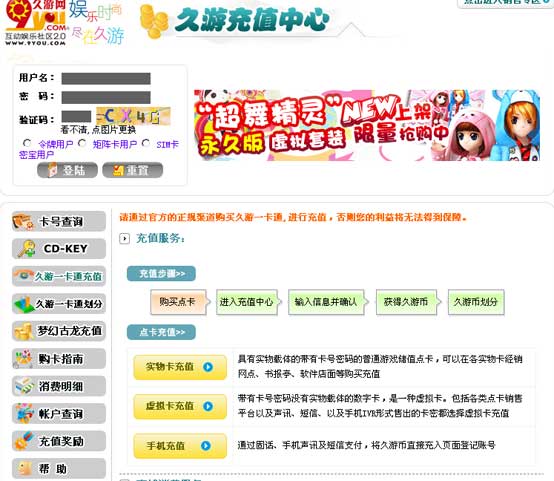 2.根据你选择的输入充值方式,会弹出相关的页面。正确的信息后,表格下方会出现“确认”按钮,点击“确认”按钮即可将久游币充值到游戏账号(特别提醒:因《超级舞者》商品购买方式为游戏内直接购买,因此充值完毕后,游戏币需划分到《超级舞者》。)