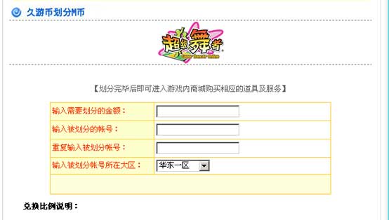 2.进入到划分页面后,正确填写自己需要划分的大区以及帐号信息。填写完毕后,点击确认,你刚才所划分的久游币就会出现在《超级舞者》游戏里。
