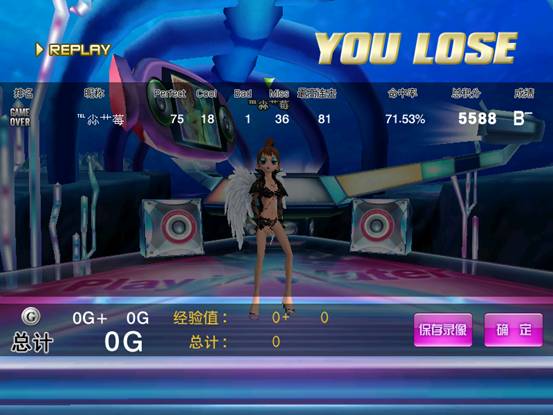 游戏结束后,游戏会自动跳出玩家游戏成绩结算画面,显示玩家游戏的名次、昵称、和游戏成绩“Perfect”、“Good”、“Bad”、“MISS”、“最高连击”等比赛成绩”,点击屏幕右下角“确定”返回游戏等待室。